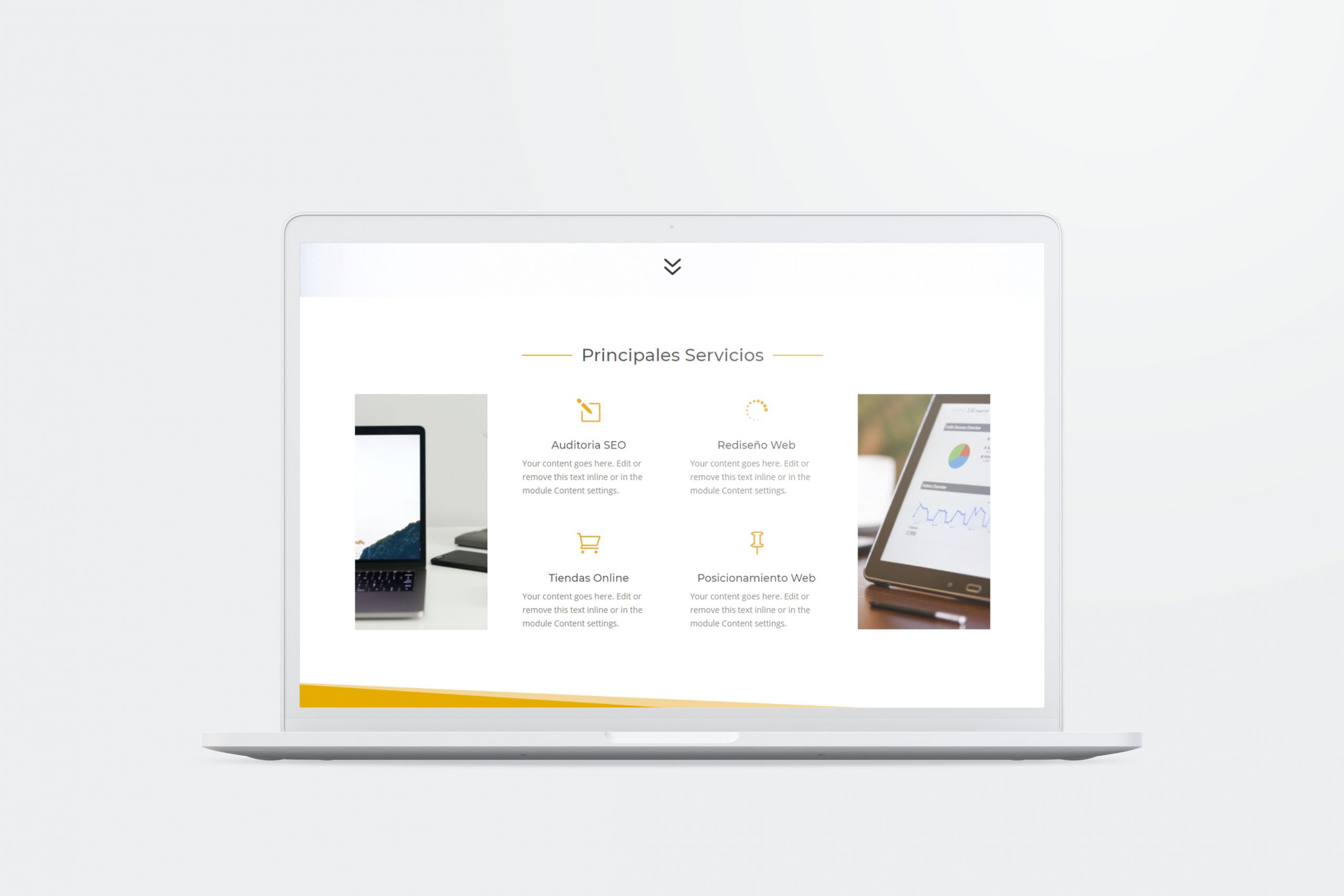 Página web corporativa para una agencia de marketing digital ficticia. El diseño es sencillo y amplio, de líneas limpias, con toques de naranja para añadir fuerza y energía al carácter activo de la marca.
